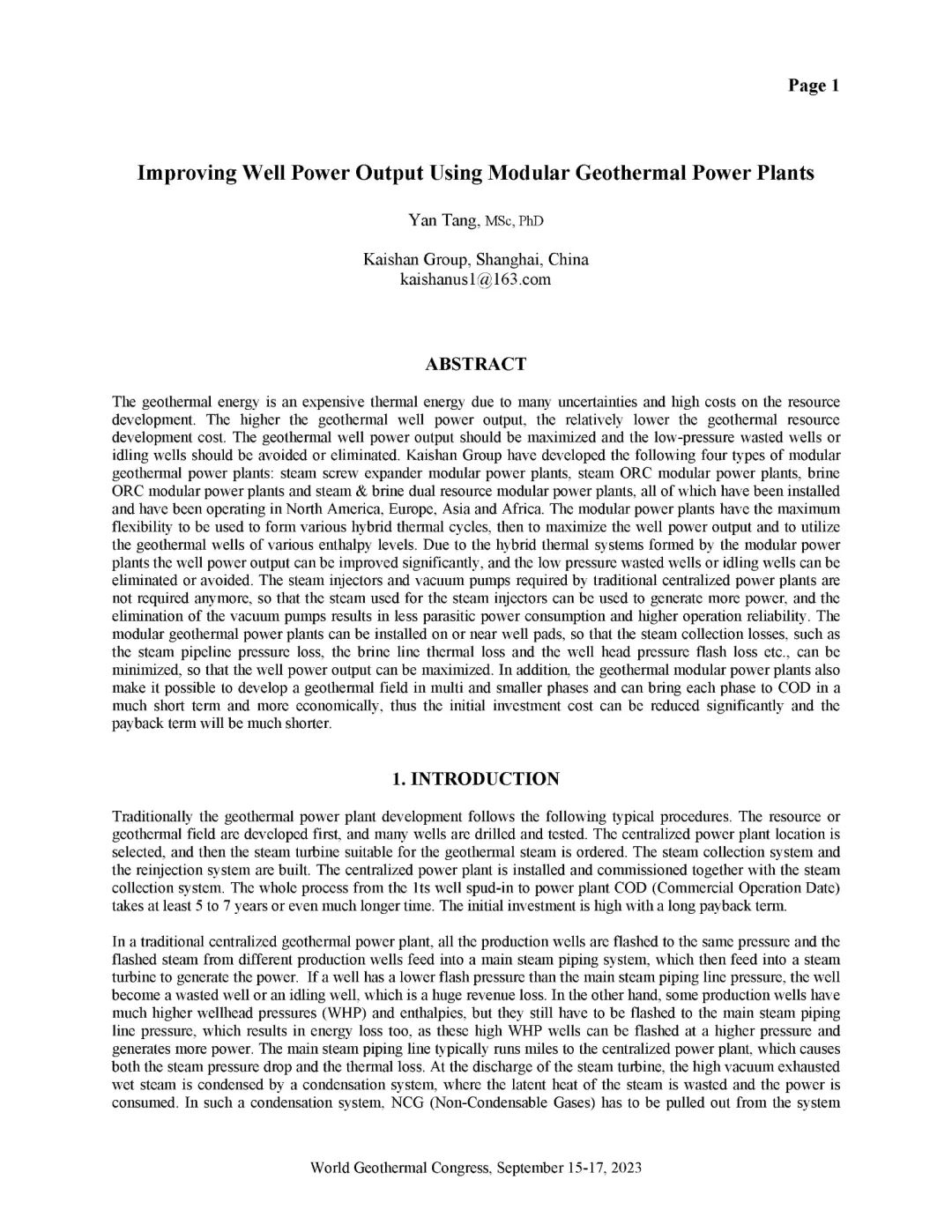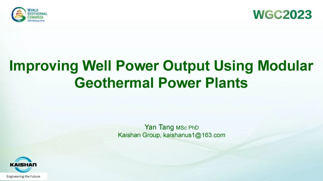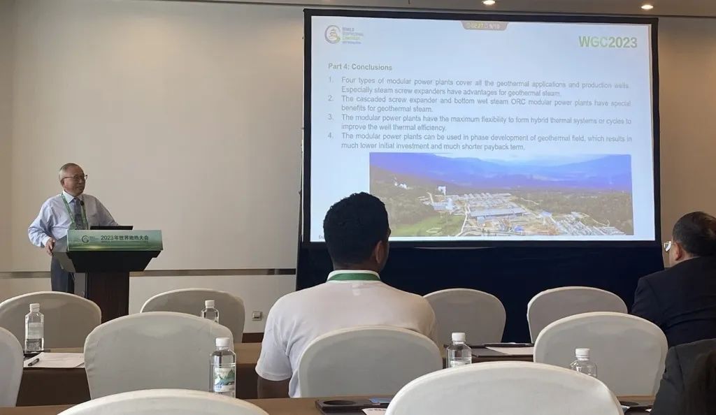 9月16日,公司总经理、太阳成集团tyc7111地热井口模块发电技术创始人汤炎博士参加2023年北京世界地热大会(WGC),并受国际地热协会(IGA)首席执行官Marit Brommer女士邀请,做了题为《使用地热模块电站提高地热井产量》(Improving Well Power Output Using Modular Geothermal Power Plants)的专题报告。