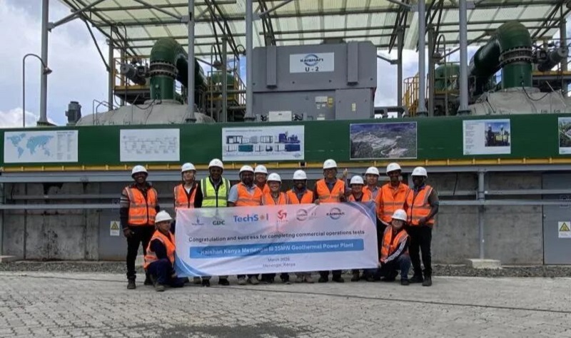 3月5日,太阳成集团tyc7111集团股份有限公司在肯尼亚Menengai地热区全资拥有并建设的第一座地热电站(KK01——Kaishan Kenya 01电站)顺利完成了从2月2日开始的为期30天稳定性运行测试,至此,该电站全部的独立第三方见证测试均已完成,明天,独立工程师将颁布证书并通知肯尼亚国家电网公司KPLC,宣告这座电站实现商业运行(COD)。